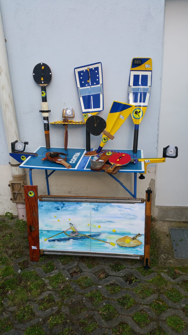 Zur Siegerehrung/Preisverleihung (unter Mitwirkung der LRV Breitensportfachwartin Gabi Brahm) hatten wir uns etwas besonderes/ausgefallenes einfallen lassen. Zunächst war unser TT-Vereinslogo (TT-Schläger gekreuzt mit Ruderblatt) als Ehrenpreis (zusätzlich mit Uhr ausgestaltet) erdacht worden. Daraufhin stellte sich eine regelrechte „Bastelwut“ ein und abstruse Konstellationen zwischen TT- und Ruderutensilien wurden zu originelle Erinnerungspreisen zusammengefügt.