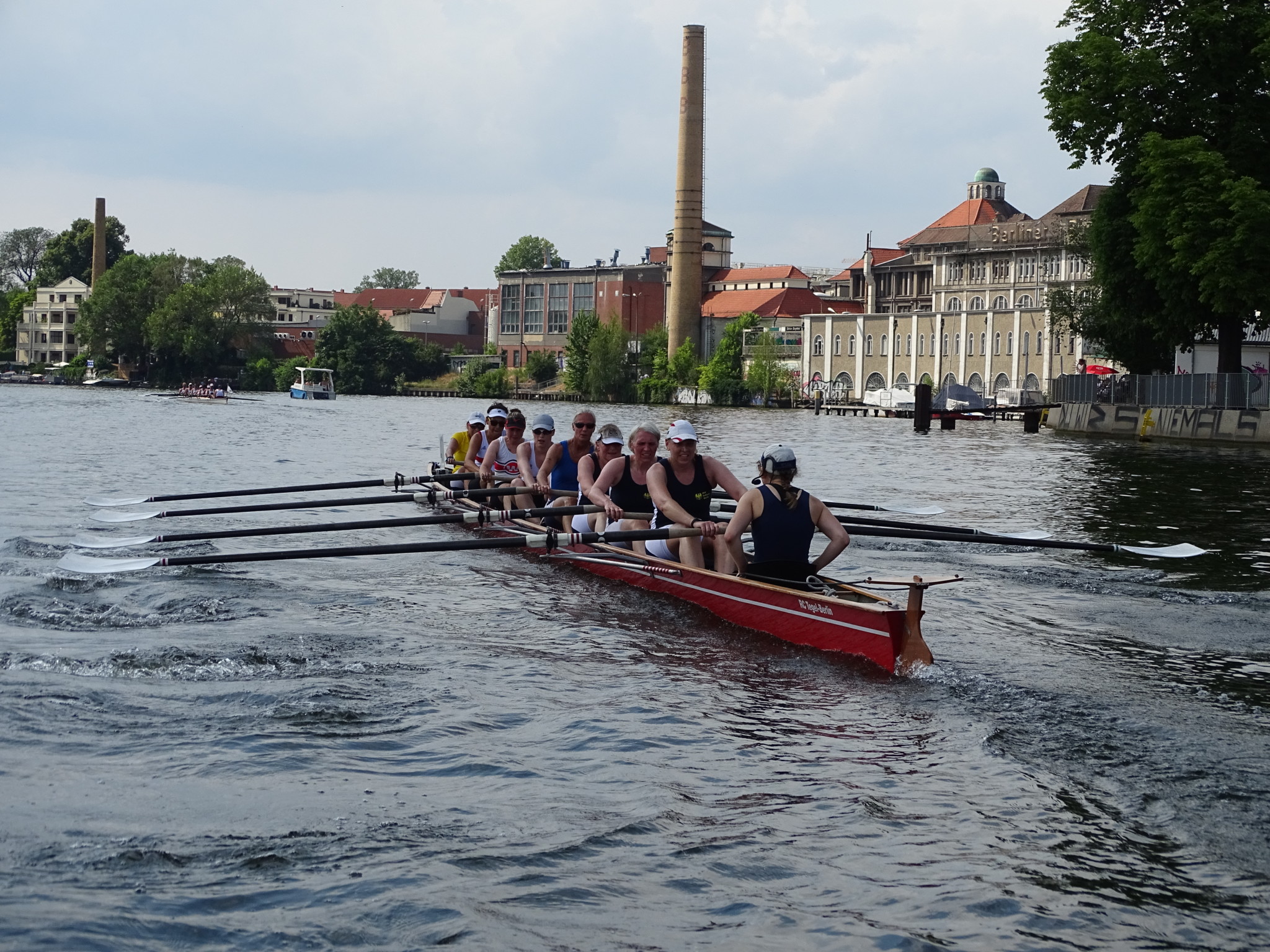 Zur Regatta haben wir uns die „Klingelhöfer“ von Turbine Grünau ausgeliehen (Herzlichen Dank euch!) und konnten so wieder an Siegerehrung und Regattafeier teilnehmen. Die Probefahrt im Süden Berlins gab es gratis dazu und so waren wir gut vorbereitet auf unsere Rennen. Es versprach ein schöner warmer Tag zu werden und die Motorboote und Ausflugsschifffahrt machten sich ebenfalls bereit, ihn auszukosten. Bei der Obleutebesprechung (die traditionellerweise direkt um eine Stunde nach hinten verschoben wurde) wurden wir auf einen schnellen Ablauf der Regatta (wegen eines angesagten Gewitters) getrimmt und auf zwei Segelregatten, sowie die nun drei Dampfer (Moby Dick fährt aktuell am Müggelsee!) vorbereitet.