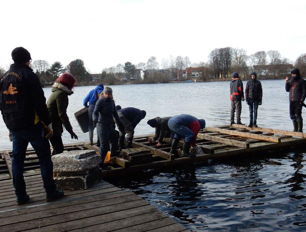 Einen Oldtimer erfreut es immer wieder, wie eifrig unsere KameradInnen mitmachen. Und wenn es um „Gewicht machen“ an den Stegenden geht. Aber es waren genug Profis, geführt von Christian, die das Tragen, Anbinden, Wippen, Schrauben sanft koordinierten. Schon am frühen Nachmittag schwamm der Steg so dass die Aktivisten sich nach getaner Arbeit zum „chilli con carne“ (von Rosi) ins Warme zurückziehen konnten.