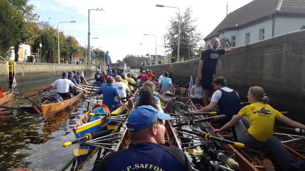 Obwohl ich am Samstag nicht mit dabei war, wurde mir zugetragen, dass alle sehr erfolgreich bei besser als erwartetem Wetter über die Strecke gekommen sind. Sportlich, sportlich und das, obwohl es keine frisch gebackenen Waffeln gab; nächstes Jahr dann! Die Party nach der Party sehr spät am Abend soll ebenfalls ein voller Erfolg gewesen sein. Viele waren wohl aber auch einfach erschöpft von der Strecke und wollten nach Hause, duschen und ins Bett, dennoch gab es in unseren Reihen Feierwütige. Eine Kameradin hat sogar, um ausgelassen an der Party teilnehmen zu können, in einem Hotel nahe Wiking übernachtet. Dieses Konzept war mir völlig neu, aber es scheint sehr praktisch zu sein. (In diesem Hotel soll es wohl auch Waffeln zum Frühstück geben…!) Wie immer hatte Wiking den wackeligen Behelfssteg aufgebaut, der alle daran glauben lässt, (noch?) betrunken zu sein. Dennoch haben wir in Etappen unseren Weg aufs Wasser und in Richtung Schleuse Neukölln, Tiergarten und Plötzensee gefunden. Unterwegs haben wir wie immer neue Freundschaften geschlossen, mein Boot besonders innig mit einem Gig-Riemen-Achter, den wir mehr als einmal überholt haben (Man nennt uns auch den Achter-Schreck der Oberhavel!), oder auch mit den Gästen eines Dampfers in der Tiergarten Schleuse, die aus irgendeinem Grund alle Angelos Namen kannten und uns daraufhin beim Überholmanöver kräftig angefeuert haben. Was mir besonders gut gefallen hat, waren die Pausen auf dem Rückweg, in denen wir uns zumindest mit drei der Vereinsvierer immer wieder gesammelt haben, Essen austauschen konnten und nette Gespräche geführt haben. Das macht, für mich zumindest, zu einem großen Teil gemeinsame Sternfahrten und letztlich unseren Verein aus. Der Sonntag verlief super, nur die unglaublich lange Wartezeit vor der Schleuse Plötzensee hat einem das Gemüt etwas benebelt. Als „lessons learned“ nehmen wir mit, das man wirklich nichts (zumindest ganz sicher nicht alles!) anfasst, was da so in der Schleuse rumschwimmt. 😉